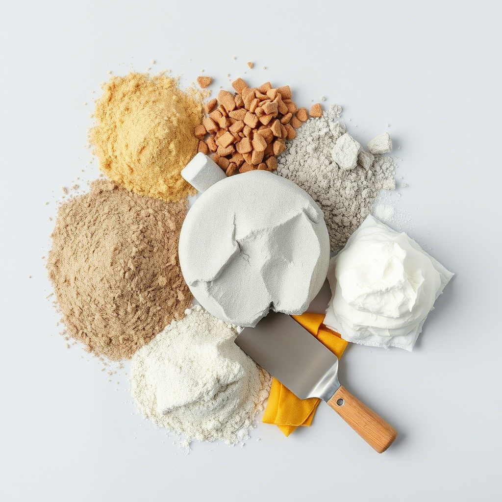 Цемент, штукатурка для внутренних и наружных работ, шпатлевка, а также универсальные грунтовки для любых работ.